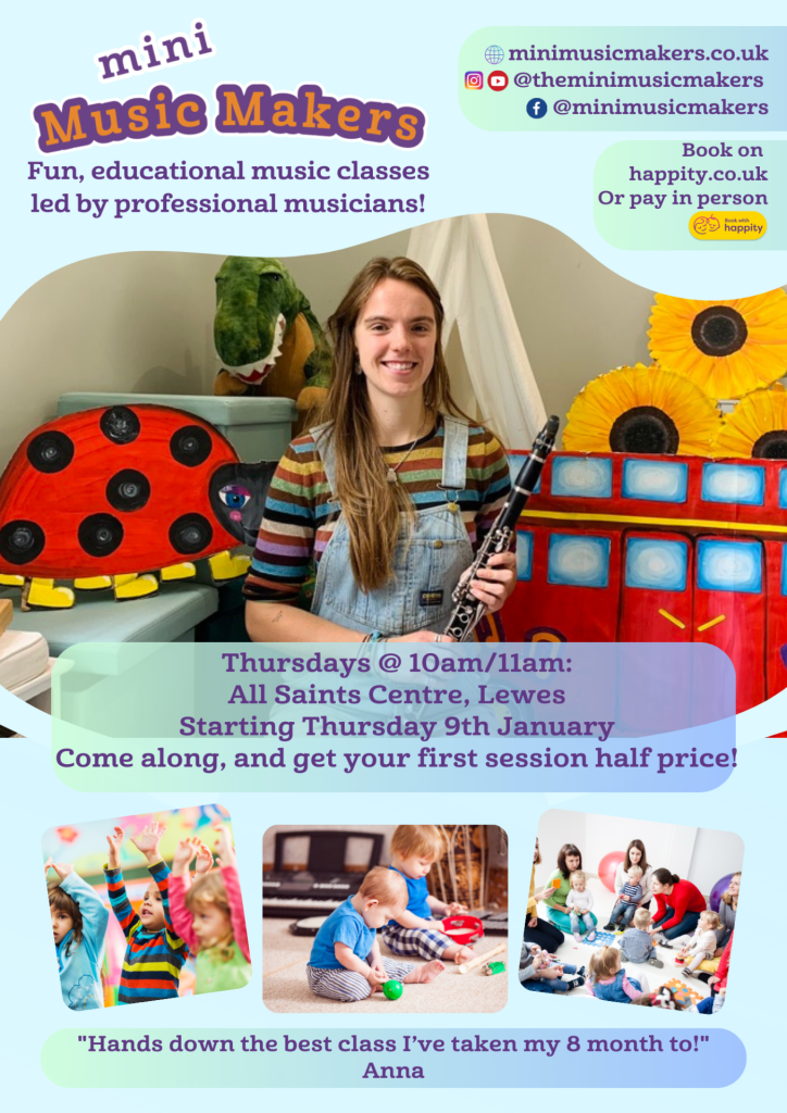 Mini Music Makers-Lewes is run by Annie, a trainee music therapist. Here is a little bit about me: Music has always been my passion! I play the marimba, clarinet, saxophone, piano and ukulele, and am currently completing my music therapy masters. I spent last winter covering Lucia's Mini Music Makers sessions in Brighton, so have lots of experience running these wonderful sessions.